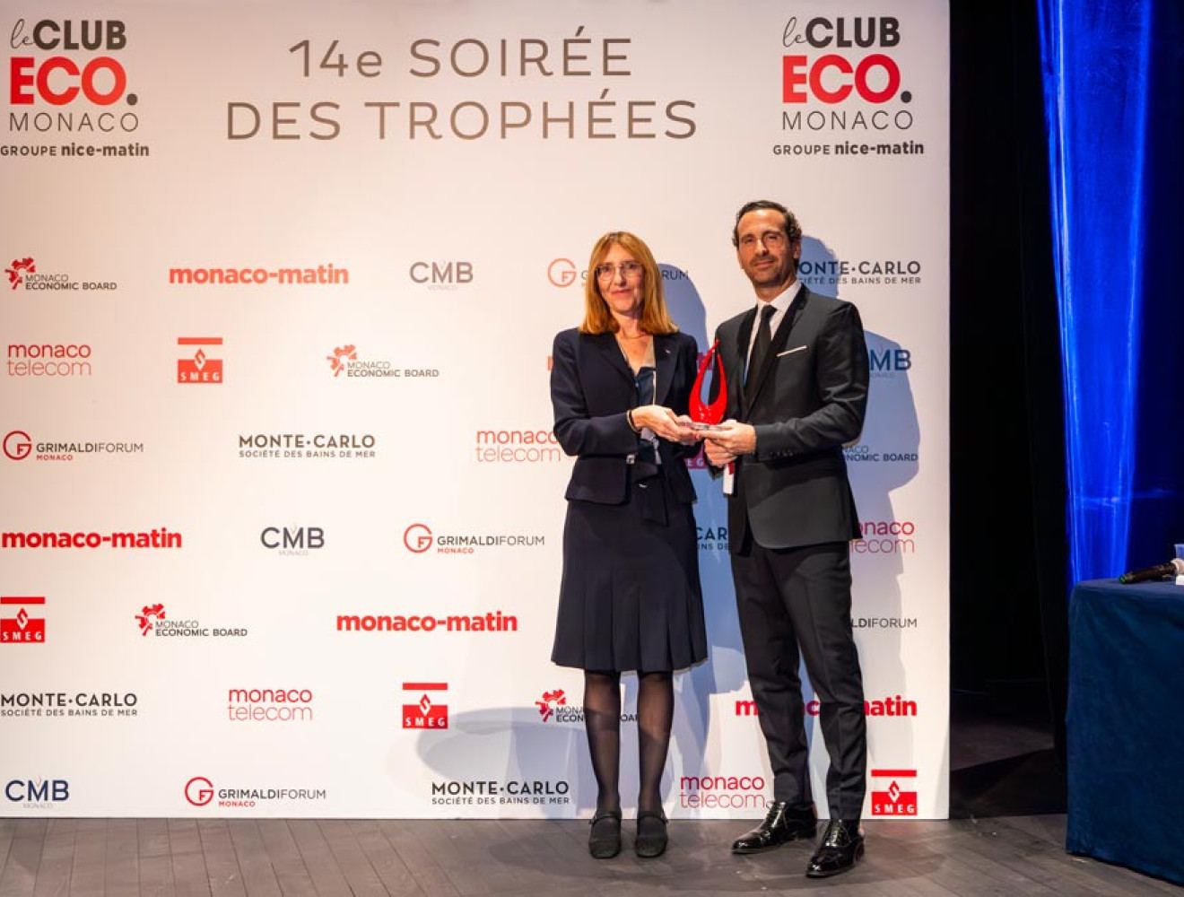 Trophy presented by Florence Larini-Negri, Director of the Mission for Energy Transition of Monaco, and Pierfranck Pelacchi, Deputy CEO of SMEG